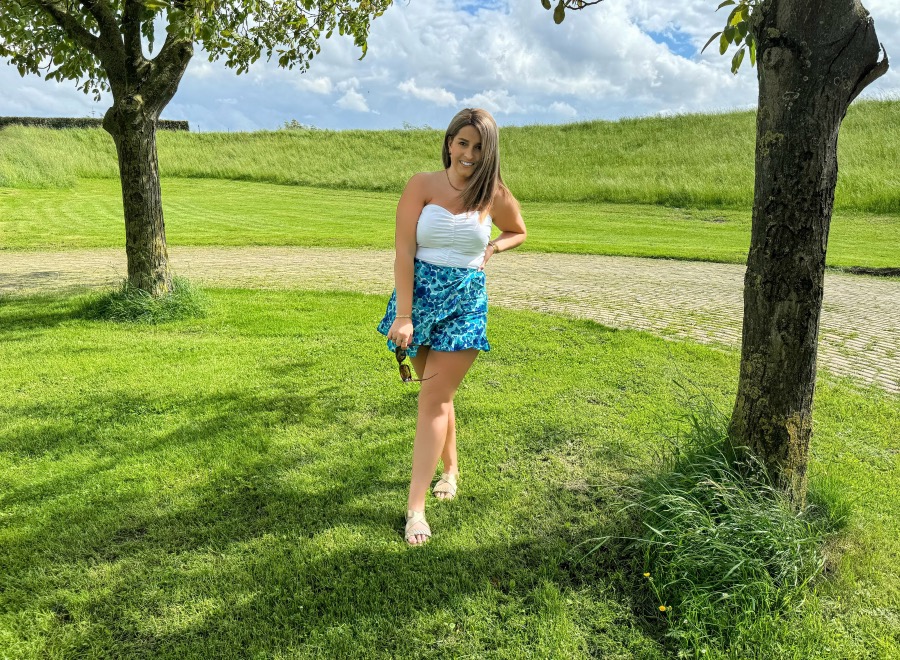 Deze kleur blauw is echt een reminder voor mij dat ik vaker blauw moet gaan dragen. De verschillende tinten blauw in deze skort passen zó goed bij elkaar. Love it! Ik ben echt dol op skorts. Het lijkt op het eerste oog een rokje maar doordat het stiekem een broekje is hoef je nooit bang te zijn dat hij omhoog waait en kun je gewoon lekker je ding doen zoals je met een short ook zou doen! Een skort is als je het mij vraagt zoveel praktischer dan een rokje en echt onmisbaar op vakantie. Heel fijn! Hoe leuk staat deze skort ook in combinatie met de witte strapless top?